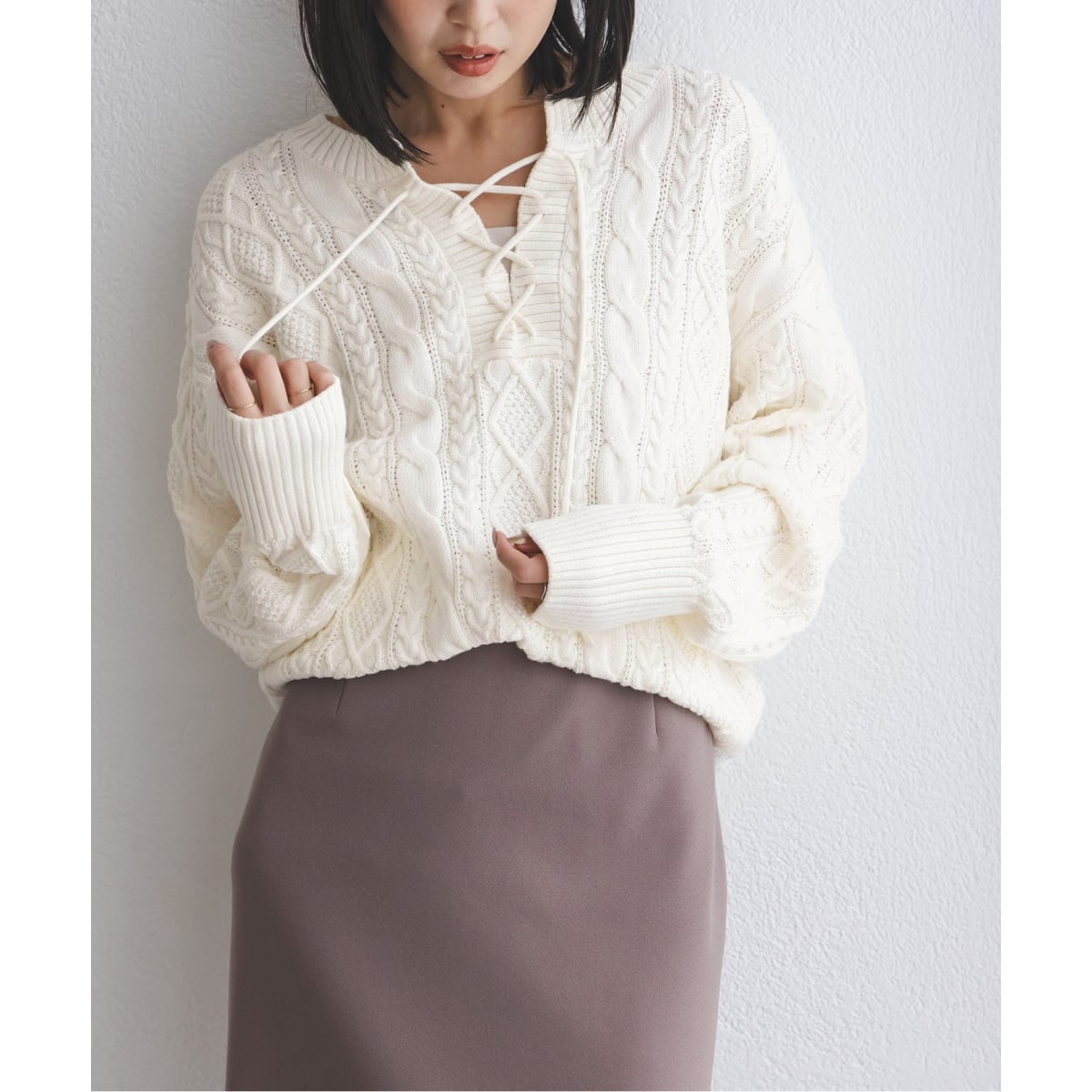 ナチュラル感のある編地に抜け感を作るように女性らしく開いたフロントは、レースアップ仕様で凝ったデザインに。
