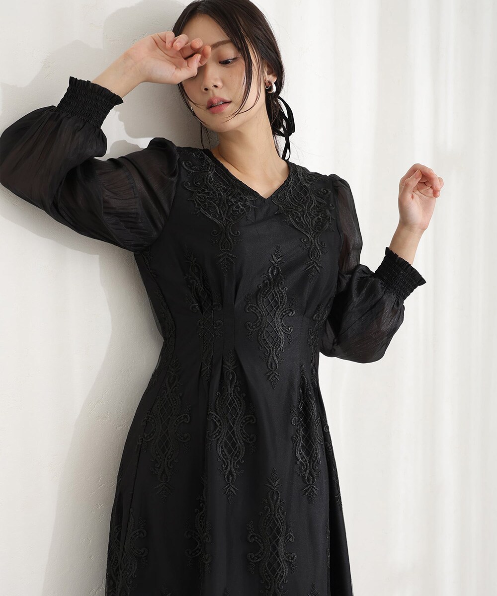 シアー素材の長袖が抜け感を与え、エレガントながらも重くなりすぎないデザイン。