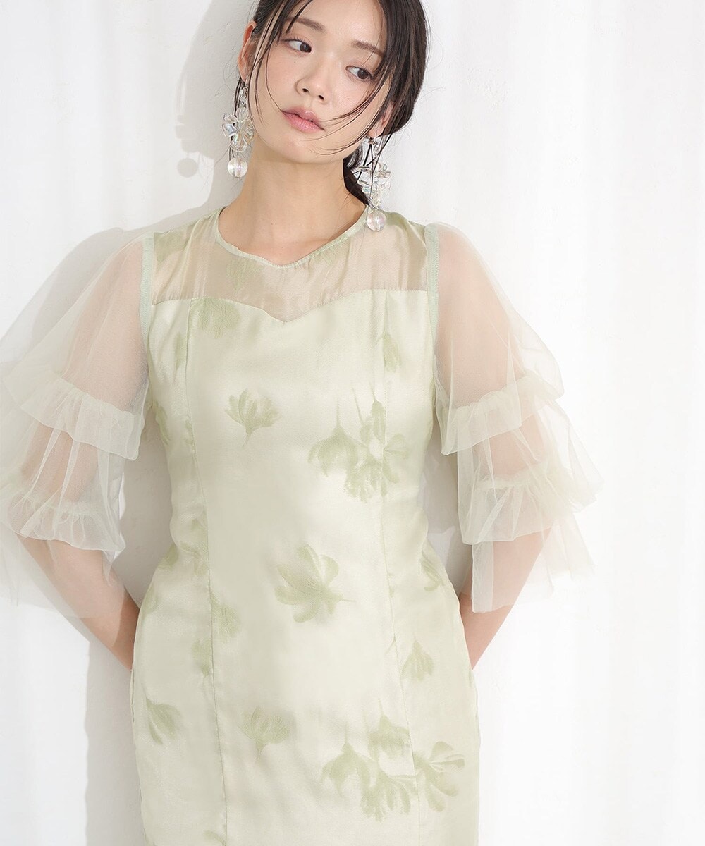 透け感のあるチュールにフリルを重ね、二の腕をカバーしながら女性らしい印象に。