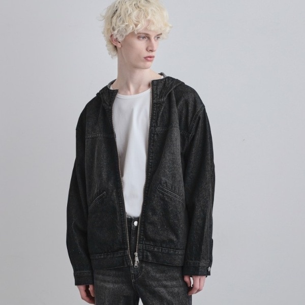 ヴィンテージのワークジャケットをデザインソースに、現代的なシルエットでアップデートしたデニムフーディー。