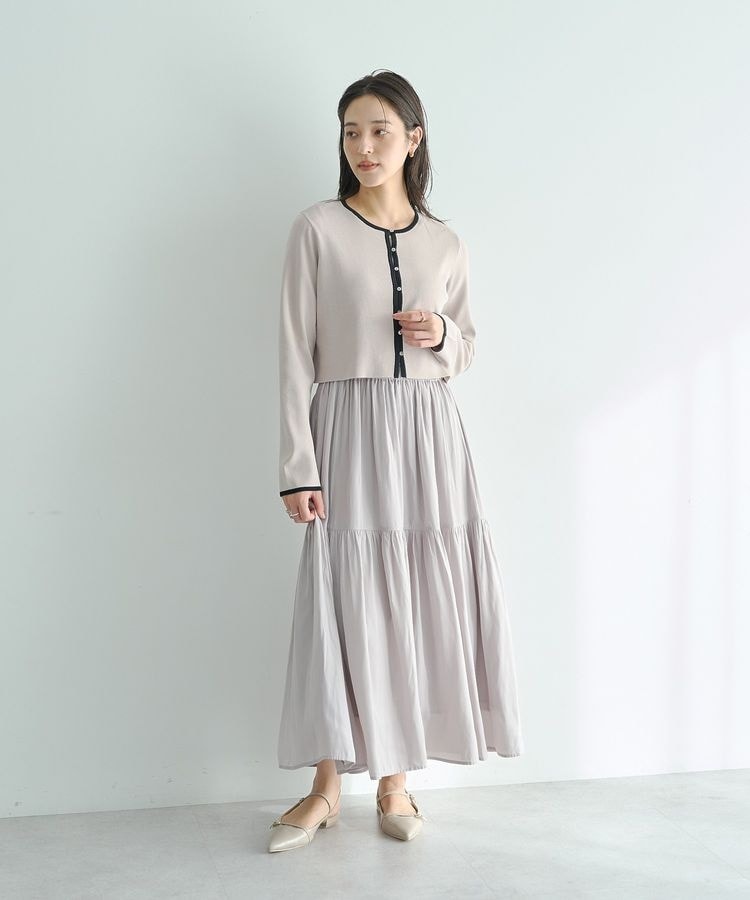 軽やかな半袖ワンピースとカーディガンの2点セット。 ワンピースはリブ編みトップスと、ティアードスカートをドッキングした異素材MIXデザイン。上品なフィット感と、ティアードの程よいボリュームがフェミニンな雰囲気を与えます。同色のカーディガンは短めの丈でウエスト位置をすっきりとした印象に。ボタンを開ければ軽やかな羽織としても使えます。配色デザインがスタイリングにアクセントをプラスします。