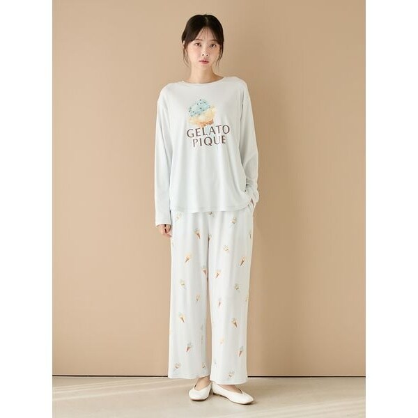 POPなスリーブ付きのコーンアイスをモチーフにした、カラフル&キュートなアイス柄のカットソーシリーズです。寒さが続くこの時期にうれしい、やや厚みのある柔らかいレーヨンを使用したロングパンツ。全体に散りばめたコーンアイス柄は、スリーブの有無やフレーバーの違いなど、よく見ると色々なアイスが描かれているのがこだわりポイントです。両脇にポケットを付けた、はきやすいストレートシルエットで仕上げました。色はストロベリーフレーバーのピンクと、チョコミントフレーバーのミントの2色展開。同シリーズのロングTシャツと合わせたり、同時期に展開するジェラート素材のランダムボーダーシリーズとコーディネートするのもおすすめです。