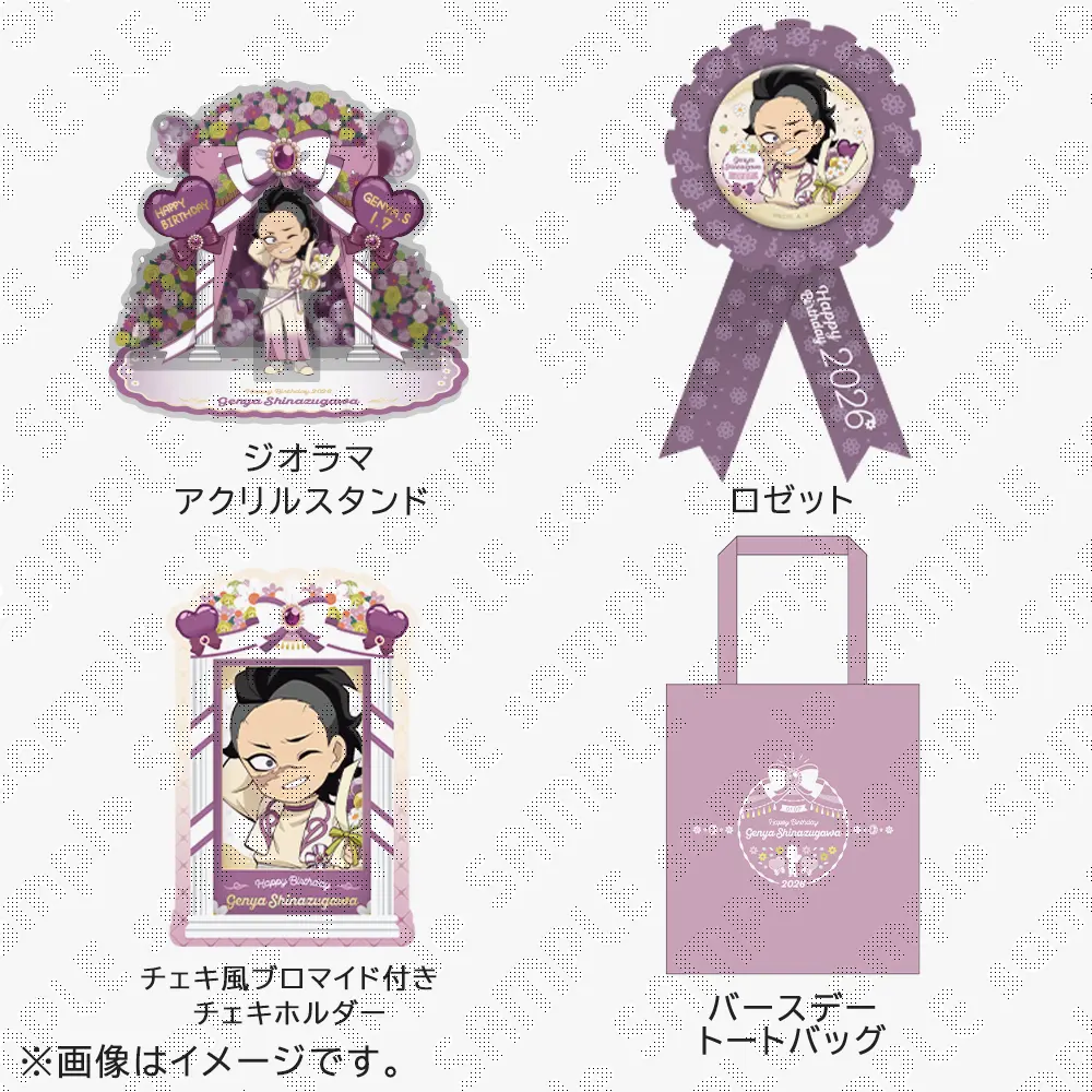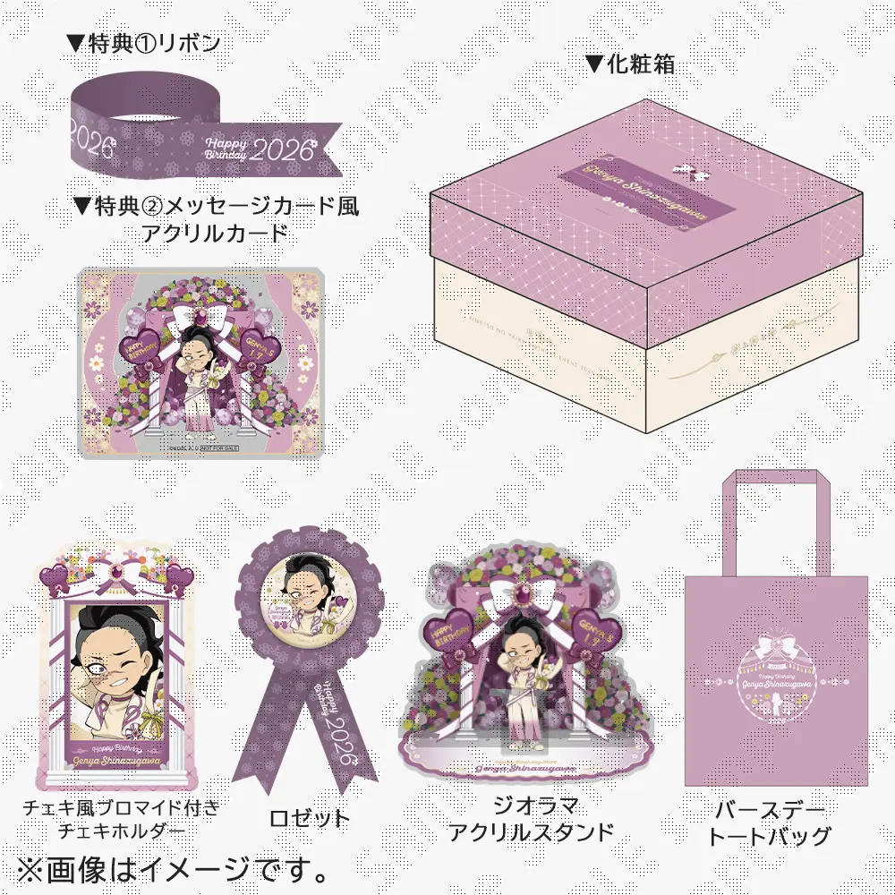 特別なデザインで彩ったこのBOXでは、誕生祭2026グッズ全4点に加えて、BOX特典としてホログラム入りアクリルカードとラッピングリボンも一緒にお届け。