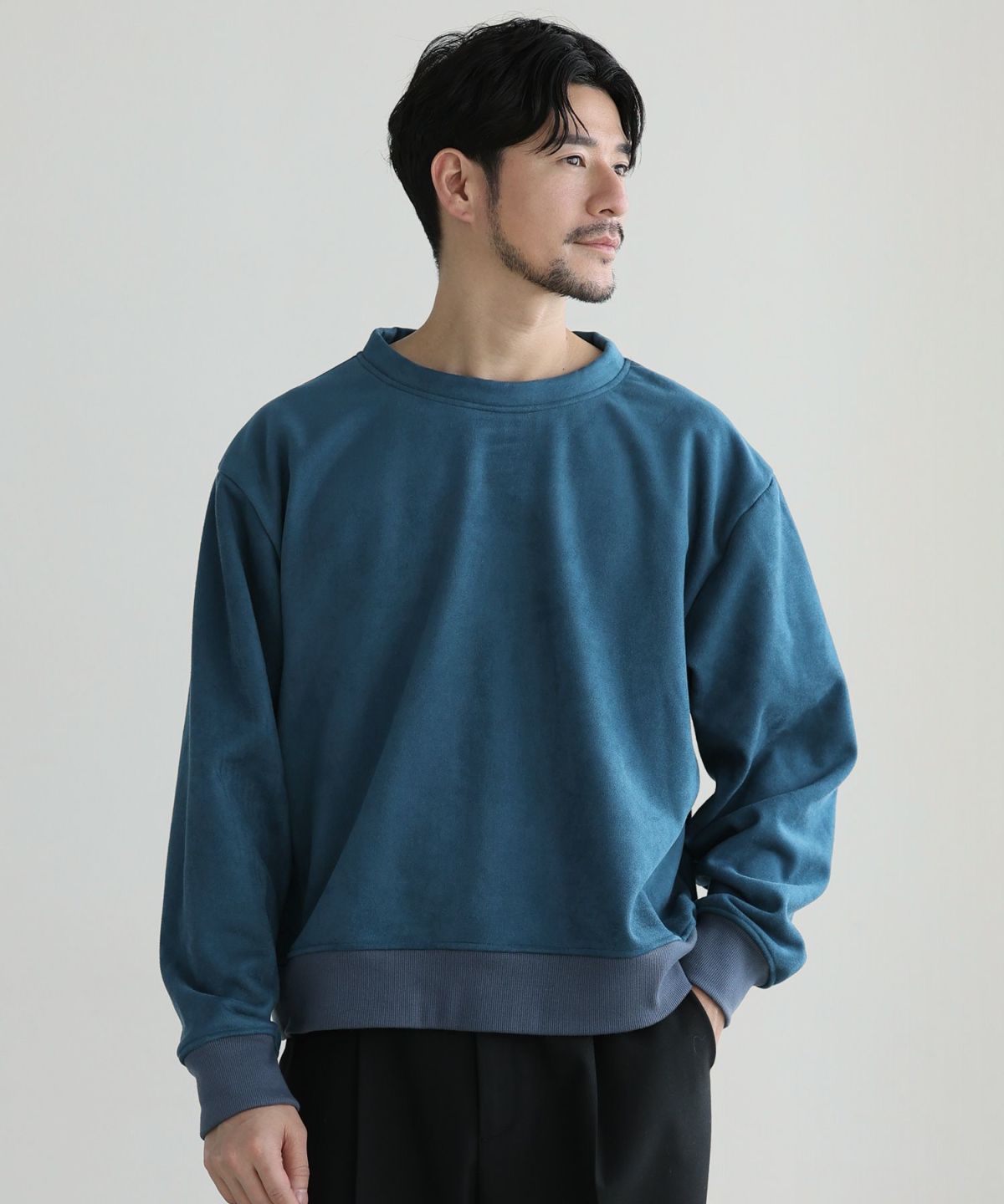 秋冬のムードを盛り上げる、フェイクスウェード素材のスウェットプルオーバー。