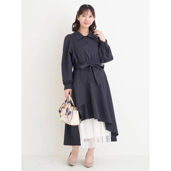 裾からのぞくプリーツチュールが大人フェミニンな印象のシャツワンピース。