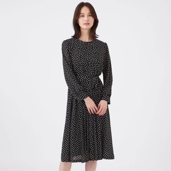 フロントのプリーツ加工がアクセントです。胸の下あたりまではプリーツが広がらないように止めが入っています。身頃部分には裏が付いていますので、比較的長いシーズン着用していただけます。共布ベルトを結んで頂きますと、すっきりとしたシルエットにもなります。オンオフ兼用して頂けます。