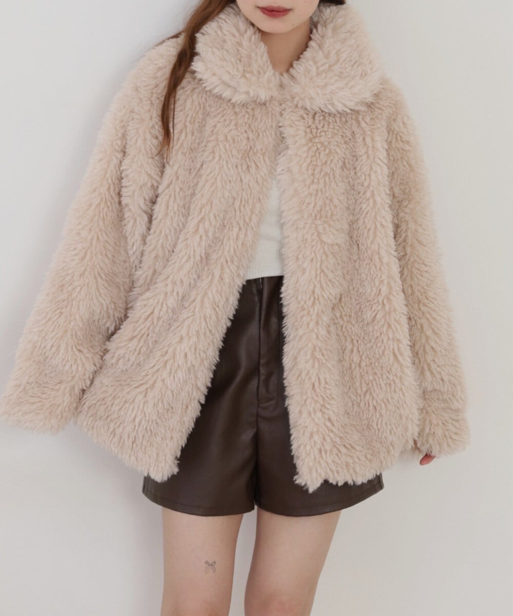 スタンドカラーが首元をすっきり見せ、ふわりとした毛足が上品さを漂わせる。