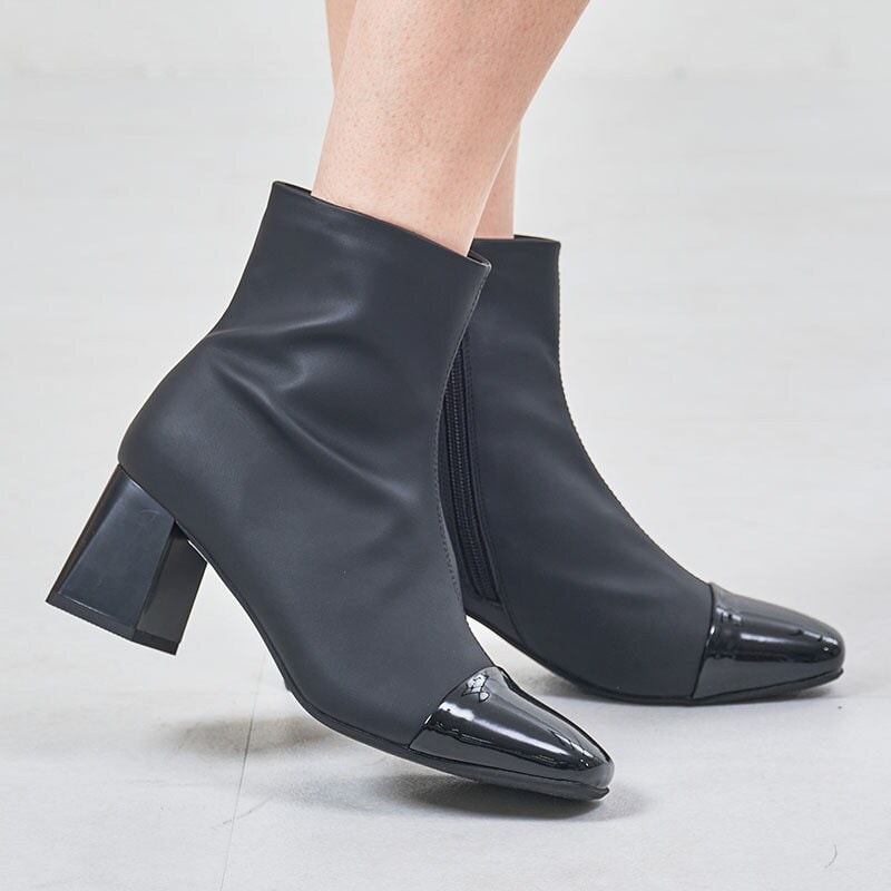 どんなコーディネートにも合わせやすい異素材ミックスのきれいめショートブーツ。