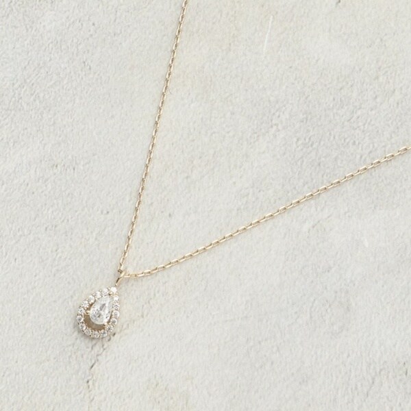 小さなしずくモチーフにミニビジューを配し、控えめに光る上品なネックラインを演出。