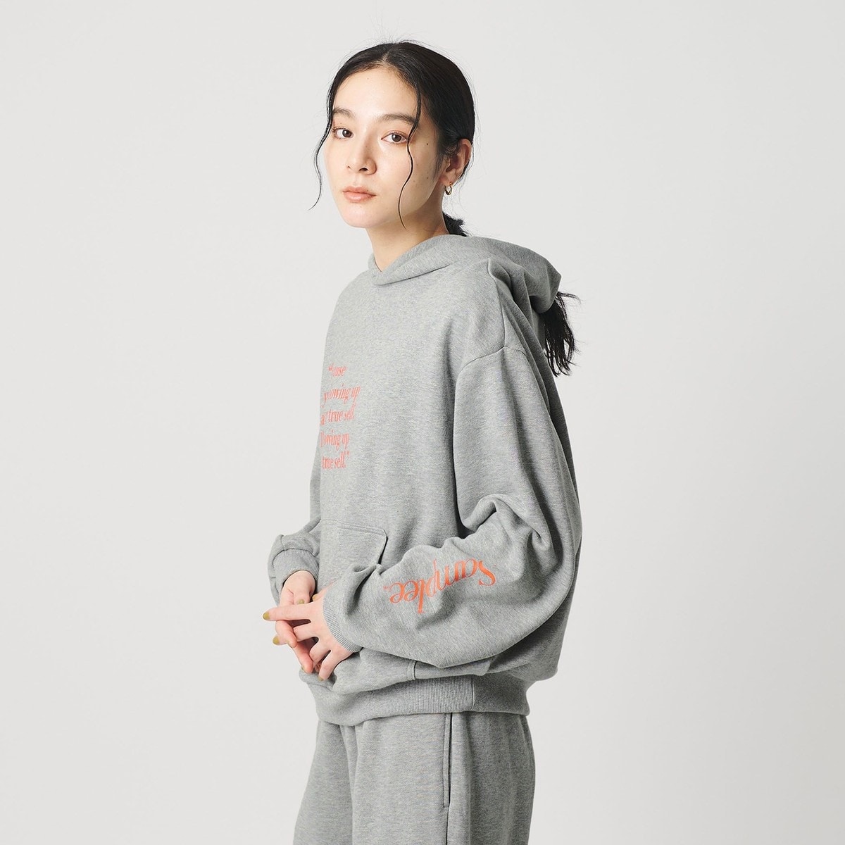 メンズのフーディのように身幅や袖はゆったりとしながらも、着丈は女性が着やすい長さに仕上げています。