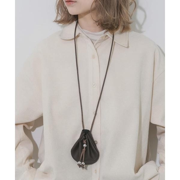 コロンとしたフォルムが愛らしい、レザー調の巾着型ミニポーチ。
