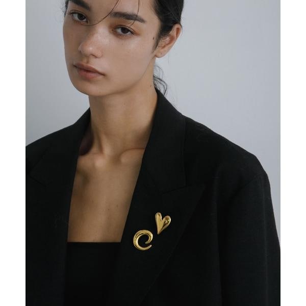 ふっくらとした立体感のあるハートと、渦巻きのようなカールモチーフの2種類がセットになったブローチ。