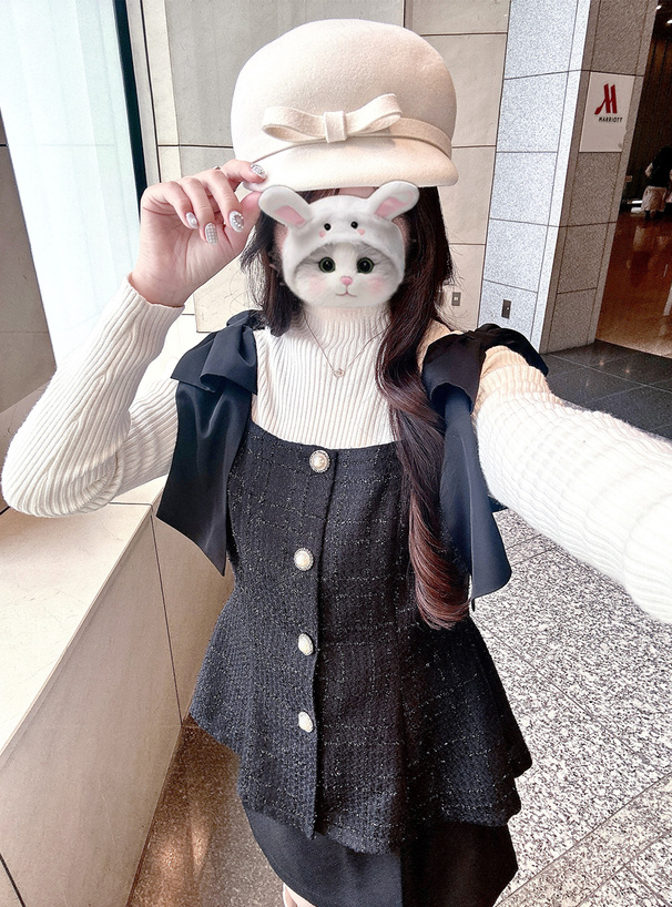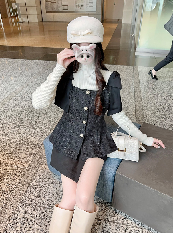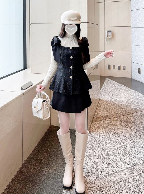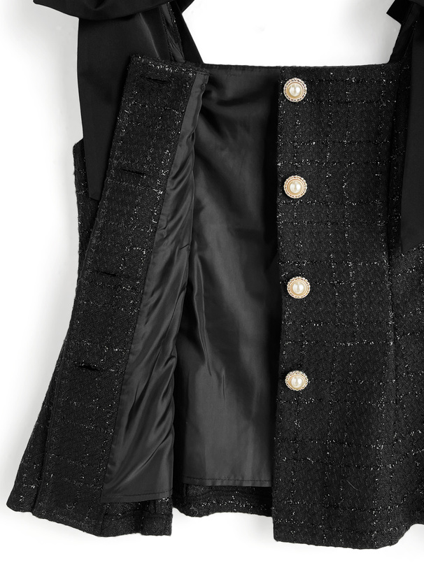 存在感のあるショルダーリボンやパールボタンで甘さたっぷりに仕上げた。