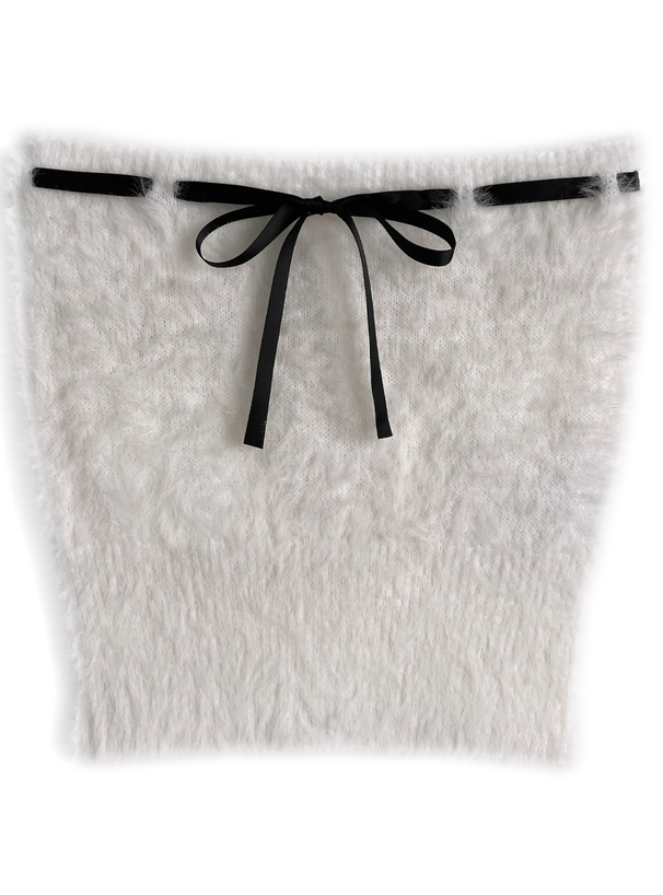 ベアトップは胸元にサテンリボンをあしらい、ガーリーな雰囲気に仕上げた。