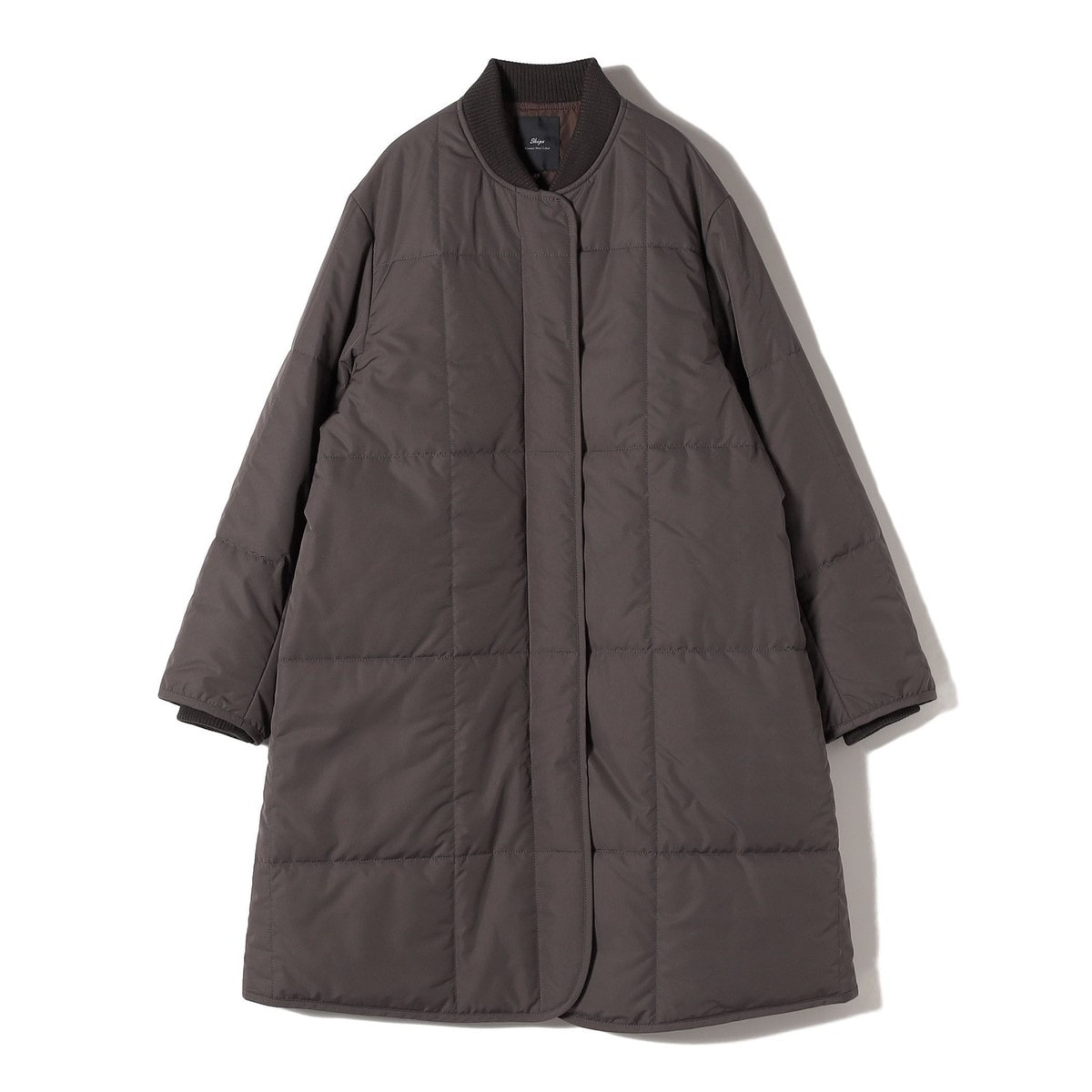 MA-1のようなリブ衿のコートは大きな格子のキルティングが目をひくAラインシルエットのコートです。