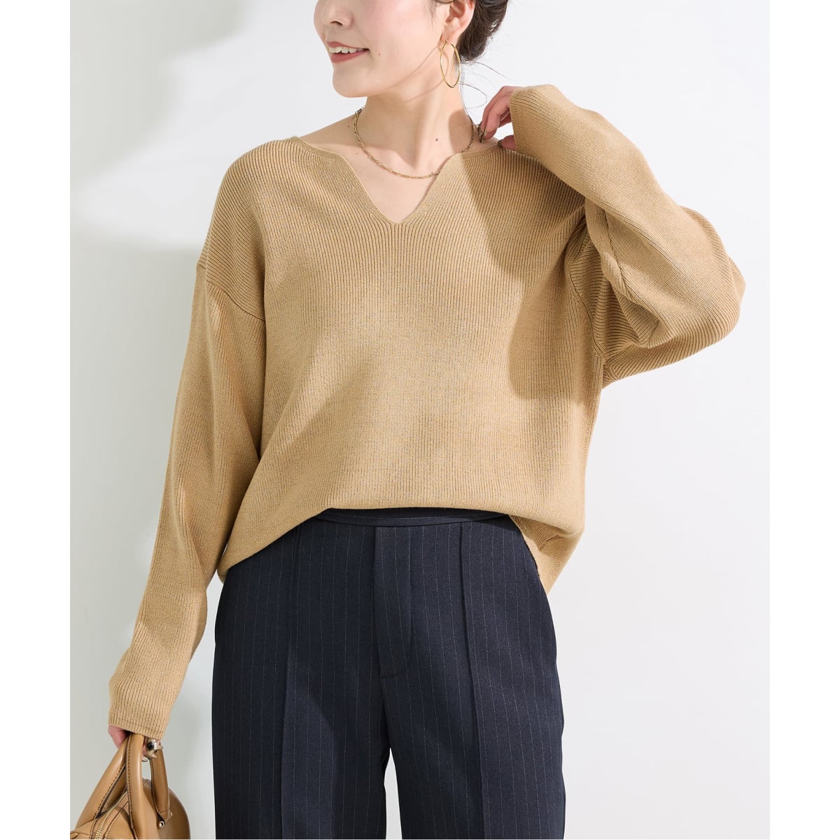 落ち感のある柔らかな質感のVネックニット。