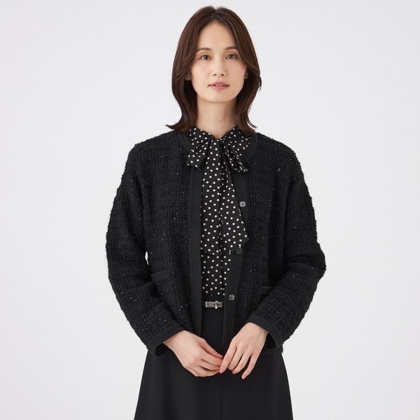上品な輝きを添えるクルーネックのツイードカーディガンです。