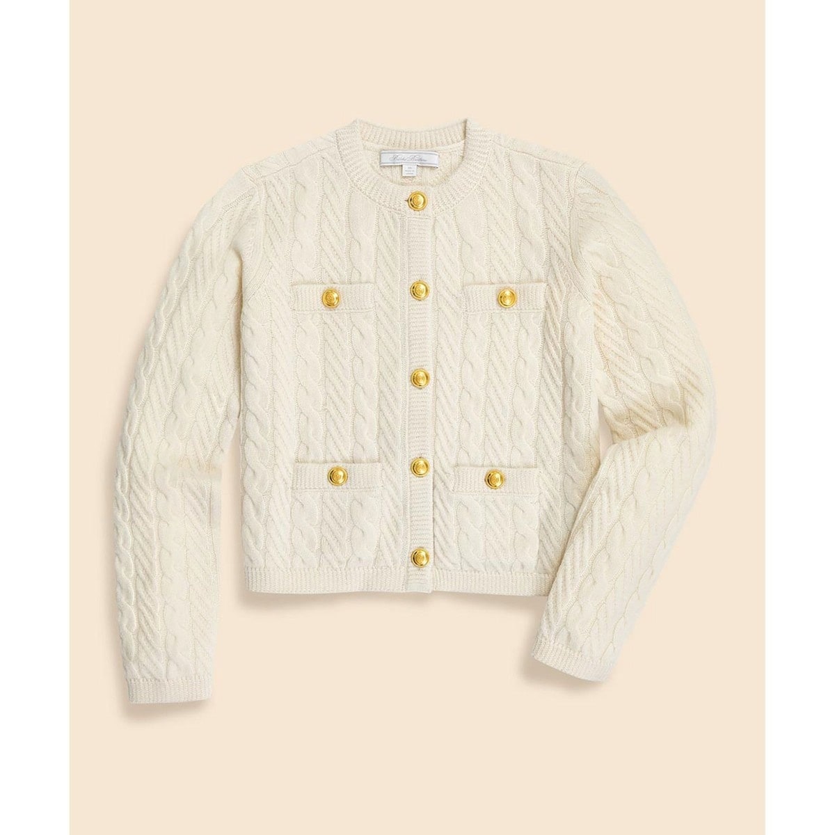 クラシックなケーブル編みと華やかなゴールドボタンが織りなす洗練されたエレガンス