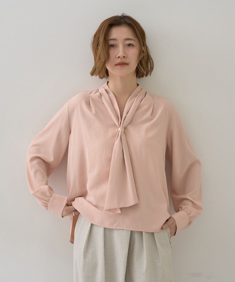 落ち感のある素材で仕立てた、美しいドレープが魅力のボウタイブラウス。スカーフリングでボウタイの表情を自在にアレンジ可能。きちんと感を出したい日はコンパクトにまとめ、こなれた印象にしたい日はラフに垂らすなど、簡単に印象の変化を楽しめます。きれいめなデザインながらもモードな抜け感があり、一枚でもジャケットインでも映えるおすすめアイテムです。
