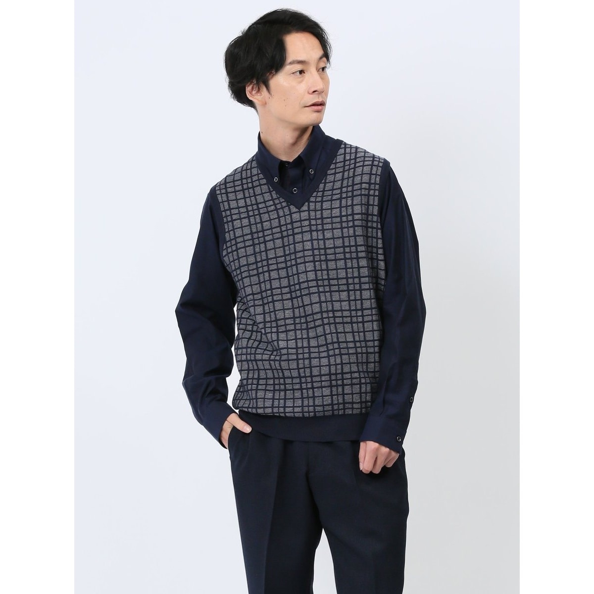 ジャケット・ワイシャツ・ネクタイで作られるVゾーンにベストを加えることで、立体感と奥行きが表現できます。カジュアルなジャケパンスタイルから、かっちりとしたスーツスタイルまでオンオフ兼用で着回し可能です。