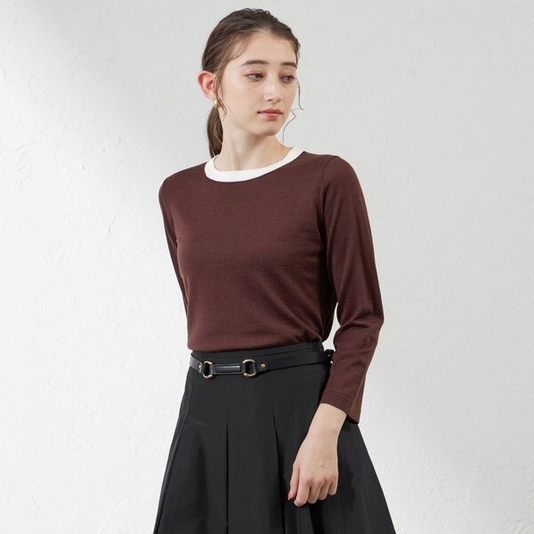 アンサンブルで着用できるコンパクトなシルエットの7分袖の丸首プルオーバーです。