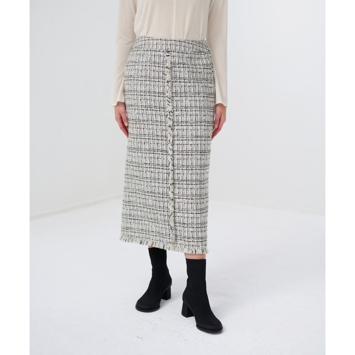 春らしいオリジナルカラーのツイードスカートは、フリンジの縦ラインとすっきりとしたシルエットで、様々なトップスとスタイリングしやすいアイテム。