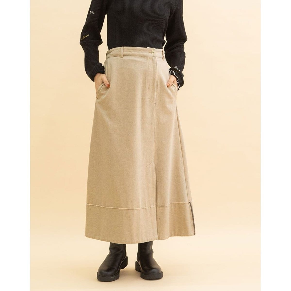 裾の太巾ロールアップデザインがトレンド感をプラスするスカート。すっきりとしたウエストラインと広がりすぎないシルエットでカジュアルなスタイリングにぴったりです。裾にスリットを入れて足捌きが良く、ウエストは後ろゴムで楽な履き心地。両サイド、後ろにポケット付き。