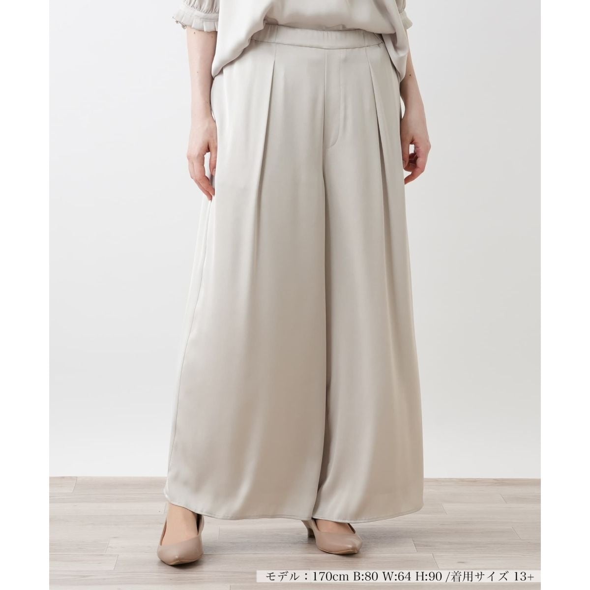 微光沢の生地が動くたびに繊細なニュアンスを描くワイドパンツ。しなやかで落ち感のある素材が縦ラインをきれいに整え、レッグラインをすっきりと見せてくれます。ウエストは後ろ部分のみゴム仕様で、見た目はすっきりとしたまま、程よいフィット感と着脱のしやすさを両立。ヒップから腿部分にかけてはゆとりを持たせたシルエットで身体のラインを拾いにくく、リラクシーなはき心地を実現します。トップスをタックインすればウエストまわりが引き締まり、自然なスタイルアップ見せ効果も期待できそうです。