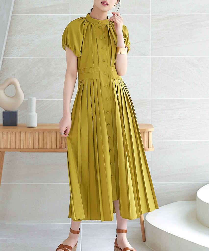 【S~3L】シアースリーブプリーツロングワンピース