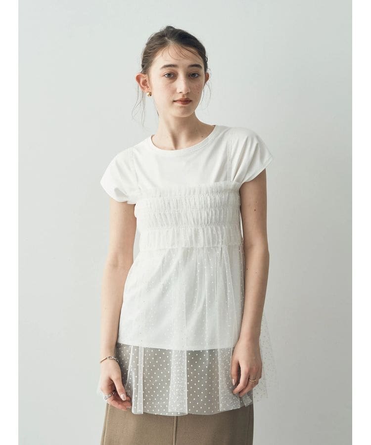 柔らかなドット柄チュールキャミソールとカットソーの2点セット。