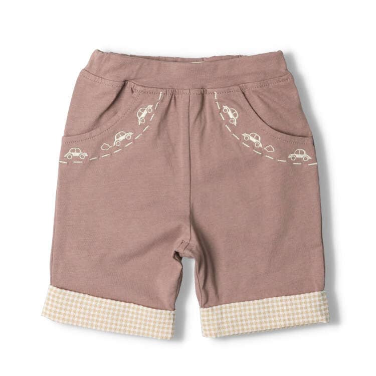 Tシャツ、天竺の柔らか素材で、ベビーでも履かせやすく、動きやすい!膝丈の5分丈のハーフパンツ。前のポケット口の車の刺繍、裾のギンガムチェック柄がポイント。ベビーらしくて可愛いアイテム。【アイテム】プレゼント ギフト 赤ちゃん服 ベビー服 贈り物 無地 シンプル カジュアル お洒落 オシャレ かわいい 可愛い かっこいい カッコイイ 普段着 デイリーウェア お出かけ着 ボトムス ハーフパンツ 短パン 半パン 子ども こども 男児 男の子 ボーイズ キッズ ベビーサイズ 幼稚園 保育園通園 2023年夏物新作 丸高衣料 コットン100% 綿100% グレー 灰色 茶色 ブラウン