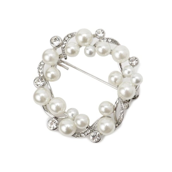 スーツやワンピースを華やかに彩るフェイクパールとビジューのブローチ。