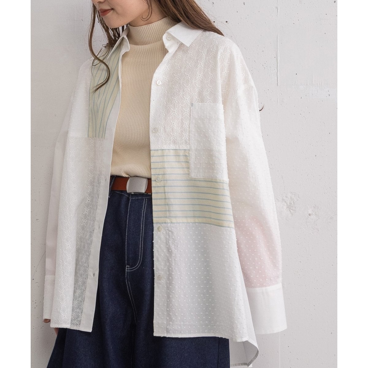 ゆったり シャツ 長袖 パッチワーク風 デニム × ストライプ L