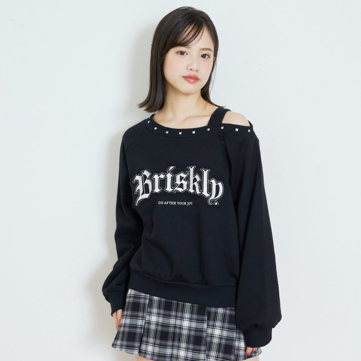 印象的なロゴ刺しゅうと衿ぐりのスタッズでおしゃれに仕上げました。