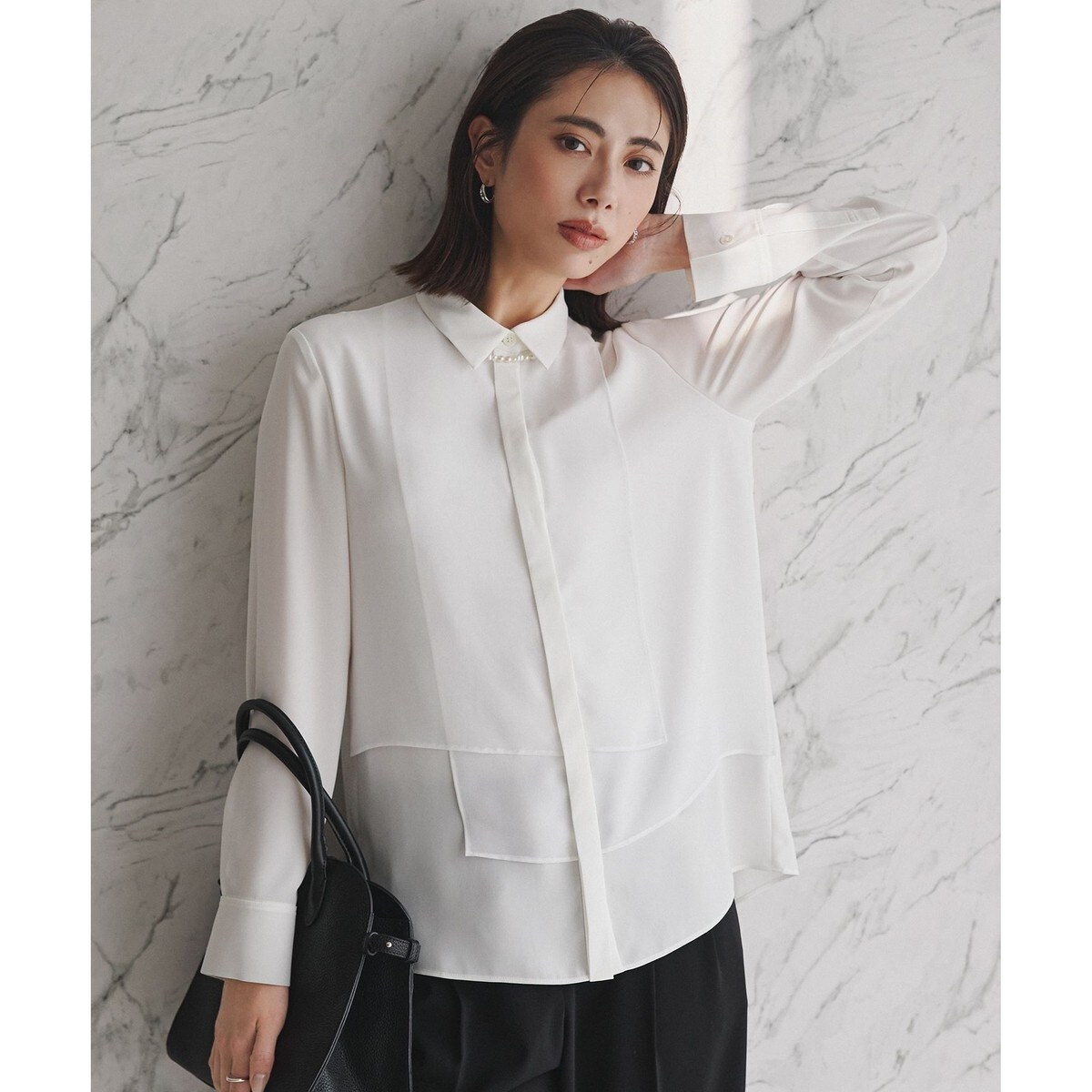 ■デザイン別布ジョーゼットを重ねたデザイン性の高いシャツブラウスです。ジャケットや羽織のインナーでも着映えるデザインで、ベーシックながらスタイリッシュな印象に仕上げています。別布部分は薄手のジョーゼットを使用している為、軽い印象に仕上げている所もポイントです。