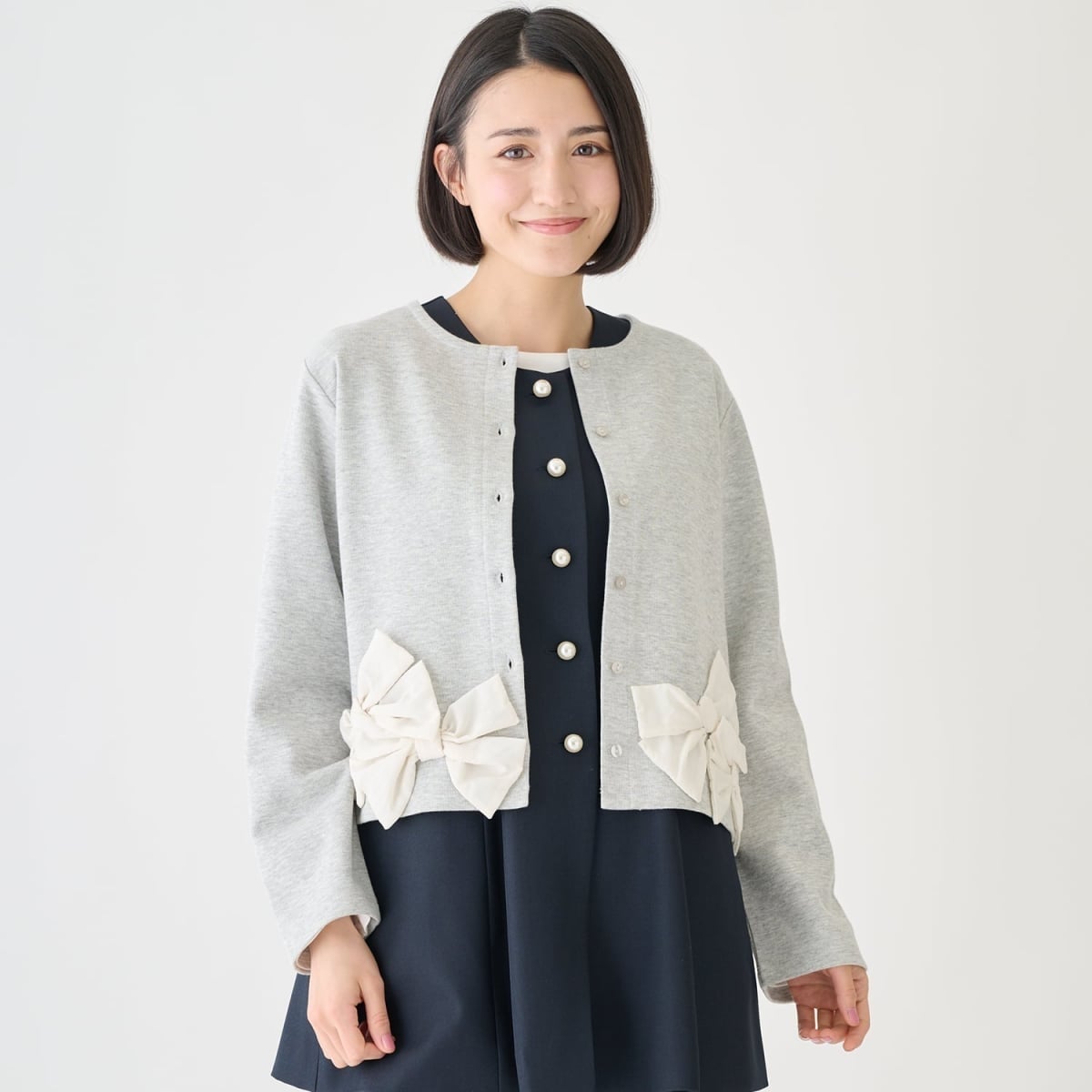 裾にほどこされたボリューミーなリボンが目を引くカーディガンです。