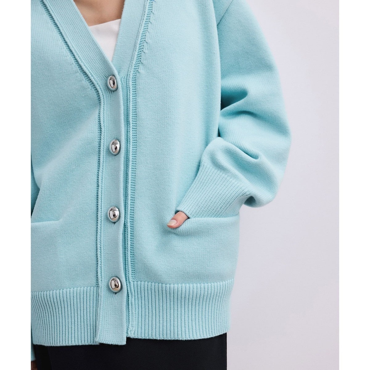 程よくゆとりのあるオーバーサイズのVネックカーディガン。