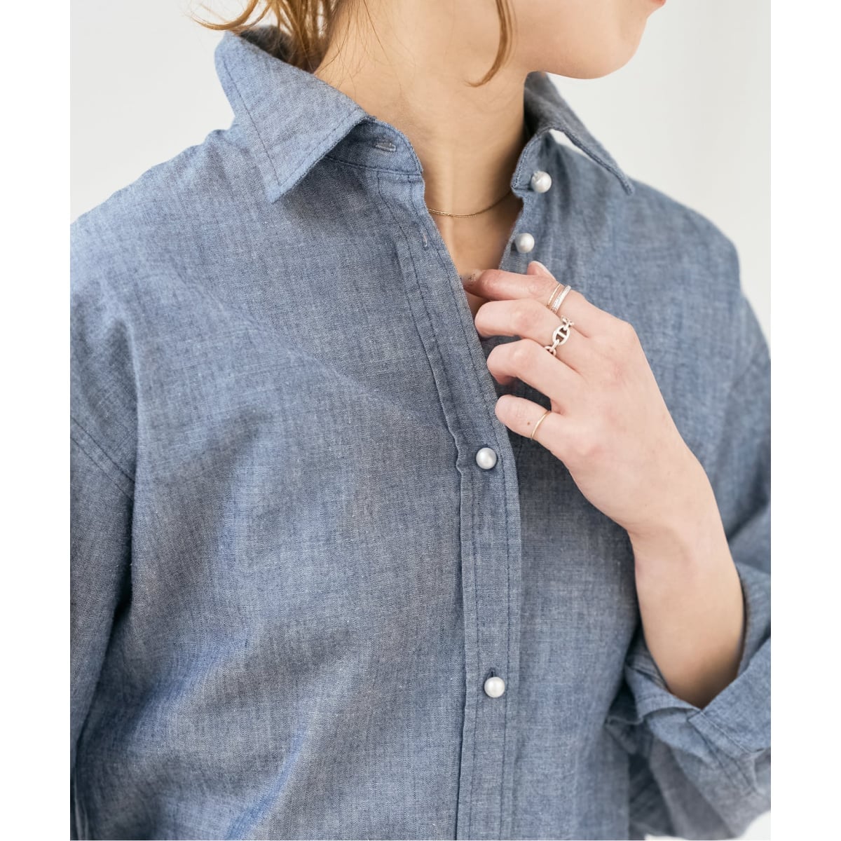 カジュアルに品を添える、コットンパールボタンシャツ。