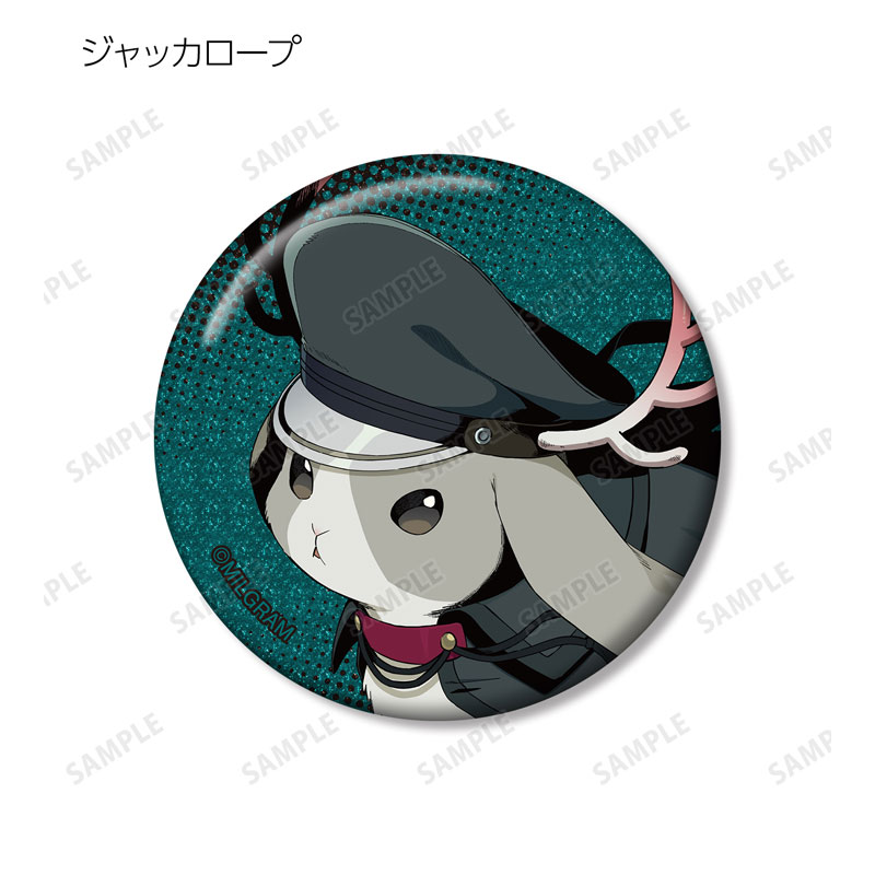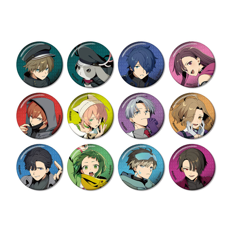 エス、ジャッカロープ、ハルカ、ユノ、フータ、ムウ、シドウ、マヒル、カズイ、アマネ、ミコト、コトコの描き下ろしイラストをグリッター加工を施した缶バッジに仕上げました。