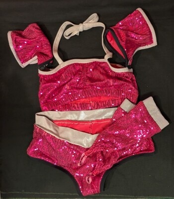 プロレスコスチューム【レイナ・イシス ビキニセット(ピンクホロラメ×ラインストーン飾り)】タグなし メキシコのボディビルコンテストにて本人使用 サイン入り サイン入り着用写真付き