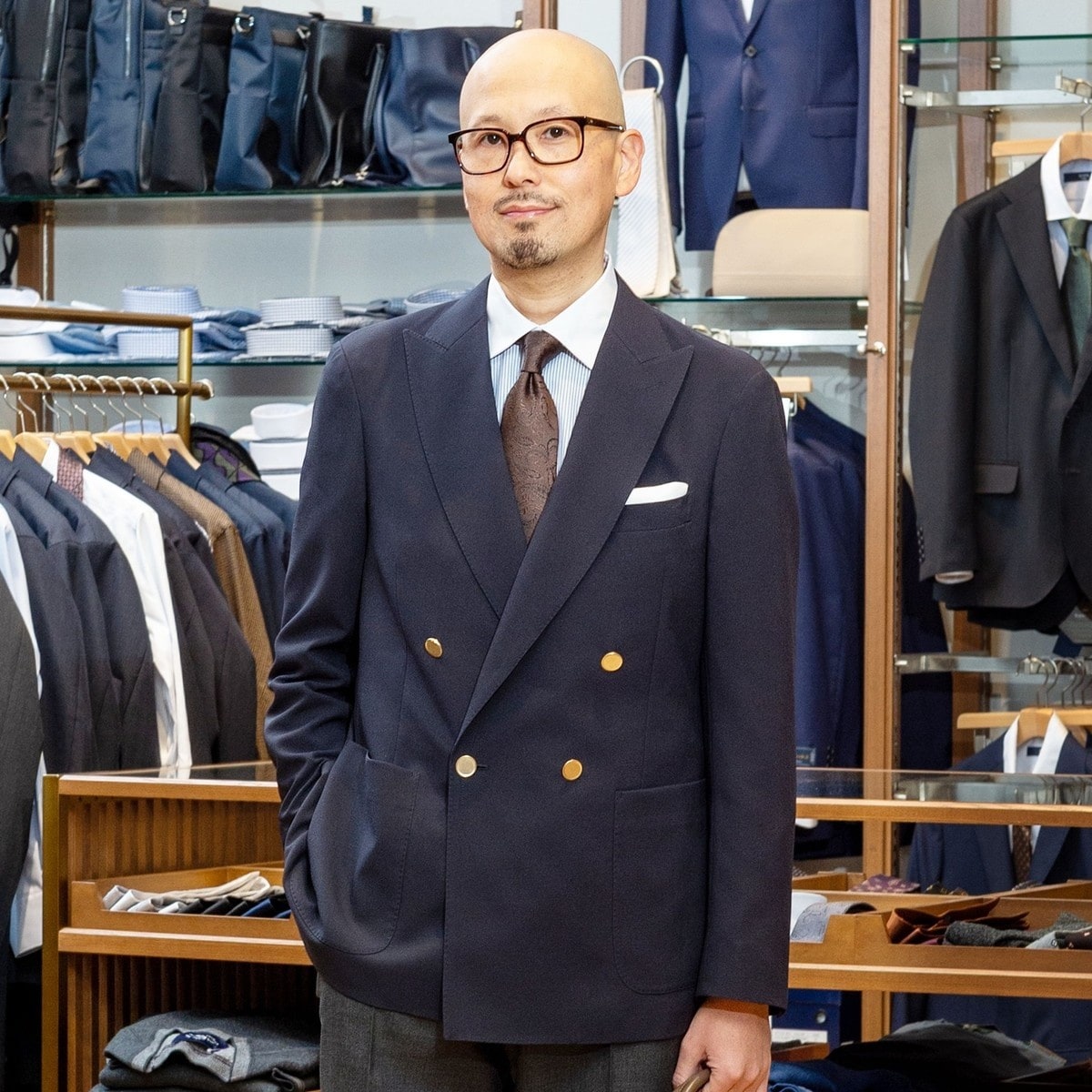適度な幅のピークドラペルや、モダンな印象を与えてくれるフラットなメタルボタンもポイントです。