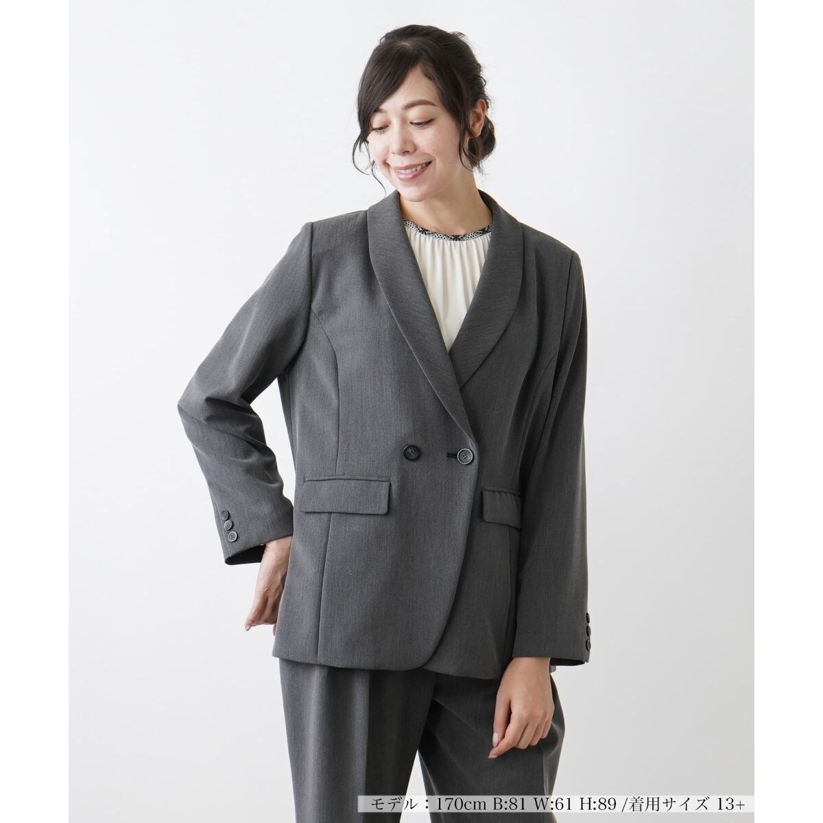 存在感のあるダブルブレステッド仕様のショールカラージャケット。緩やかにラウンドした襟が大人の女性らしいエレガントな雰囲気を漂わせます。ポリエステルにレーヨンをブレンドしたやや薄手の柔らかな生地を使い、適度にストレッチを効かせ、快適な着心地を叶えました。オンオフを問わず、多彩なシーンでフレキシブルに活躍してくれる一着です。同素材のパンツとのセットアップコーディネートもおすすめです。