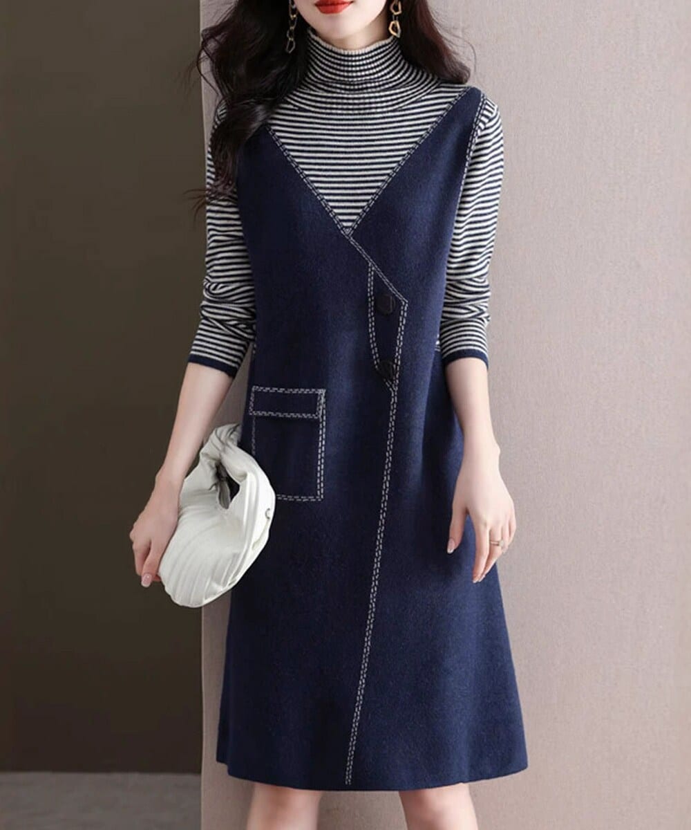 秋冬のレイヤード風を楽しめる、ボーダーニット×ジャンスカ見えのニットワンピース。