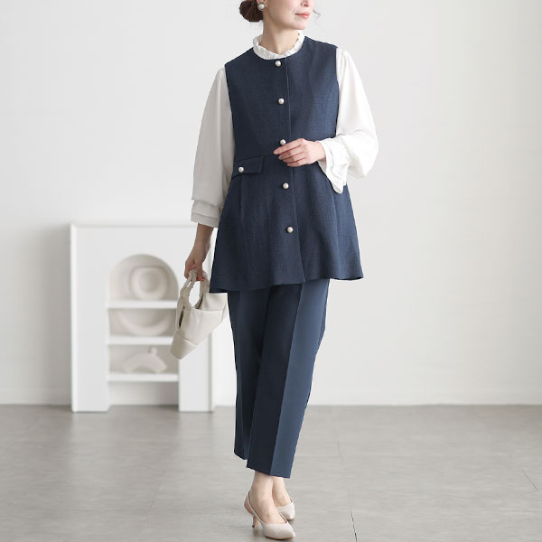 きれいめセットアップとして活躍する、ベスト&ブラウス&テーパードパンツ。学校行事やオケージョン、通勤まで幅広く使える頼れるアイテム。ツイードペプラムベストはウエスト切替えから広がる立体的なデザイン。ウエストを高く見せて、ふわっとしたシルエットでお腹やおしりをカバー。パールボタンやポケット付きのきちんと感が上品な印象をプラス。フリル&キャンディ袖のブラウスもとろみ感ある素材で上品な印象へ。ウエストゴムのテーパードパンツはセンターライン入りで簡単に美脚見せ。単品でも使いやすく、どんなコーデにも万能。学校行事、オフィスカジュアル、きれいめなお出かけまで対応。大人の女性の日常に寄り添う安心感と実用性を兼ね備えたおすすめのセットアップですよ☆