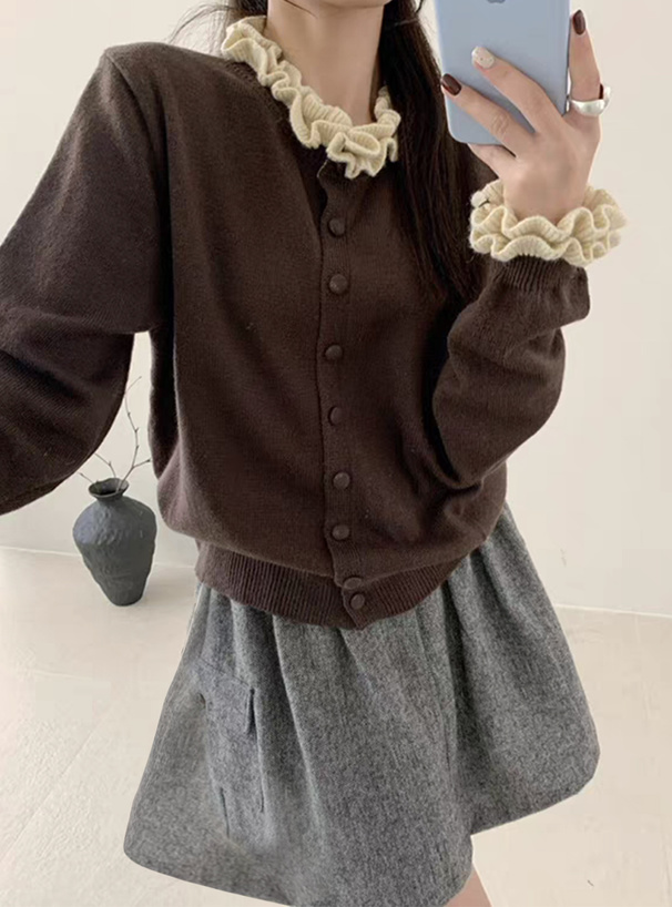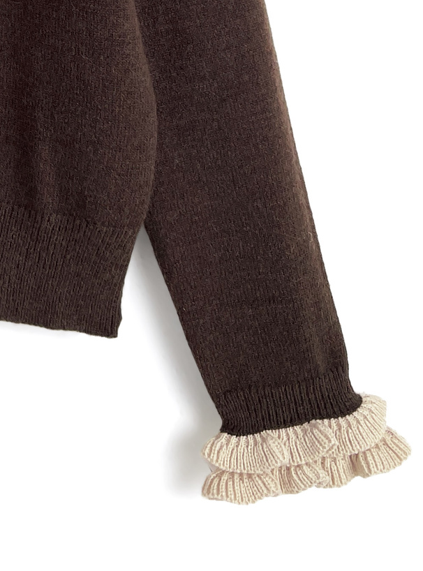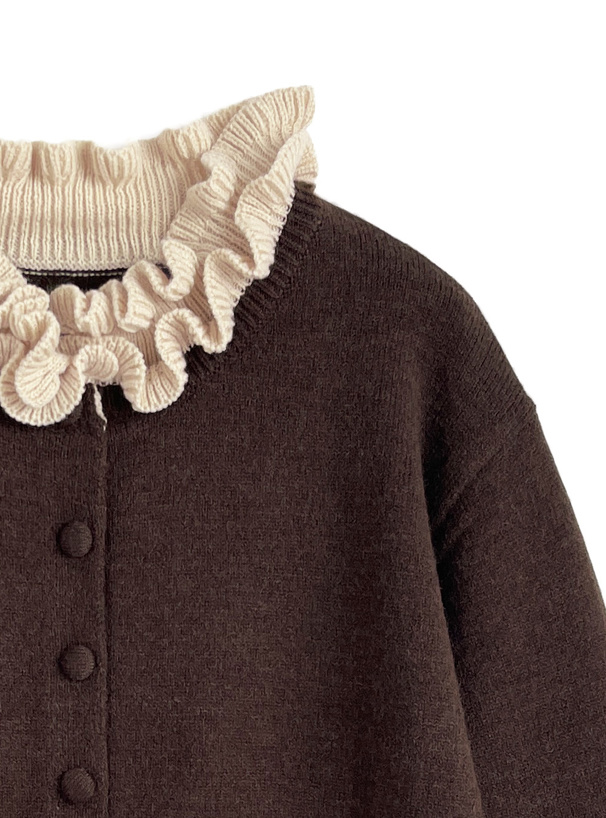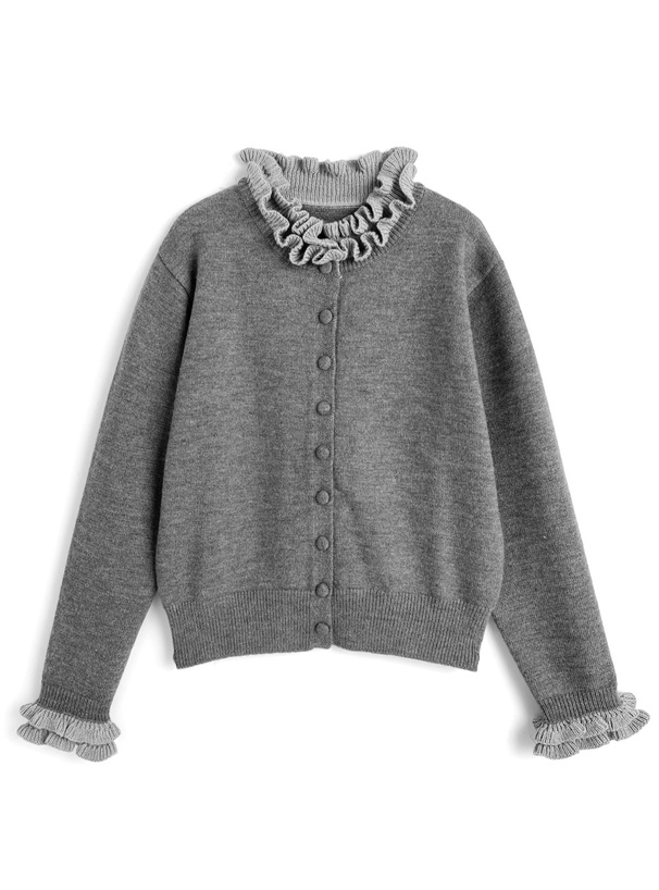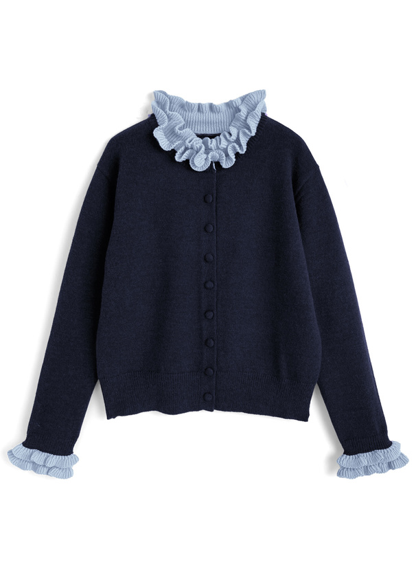 首元と袖口にあしらった配色フリルが目を惹くニットカーディガン。