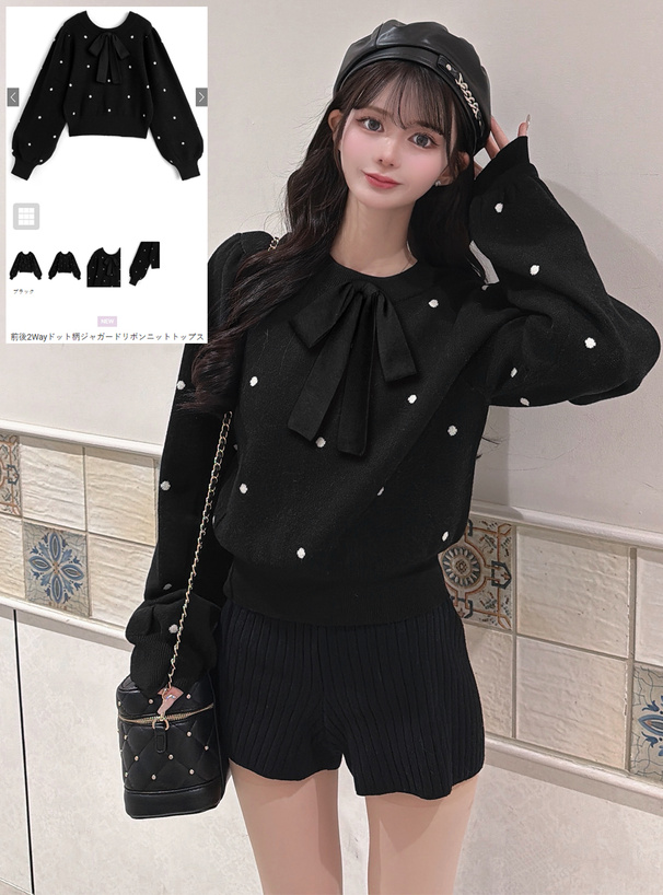 ネック部分にはリボンをあしらい、フェミニンなワンポイントをプラス。