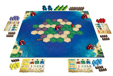プレイヤーは自分の冒険者コマをゲーム盤の四隅にある陸地に移動させ、なるべく多くの宝物を持ち帰ることを目指します。ただし冒険者コマの底には、その冒険者が持ち帰った宝物の価値を示す数字が書かれており、どのコマを優先して脱出させるかも重要となります。
