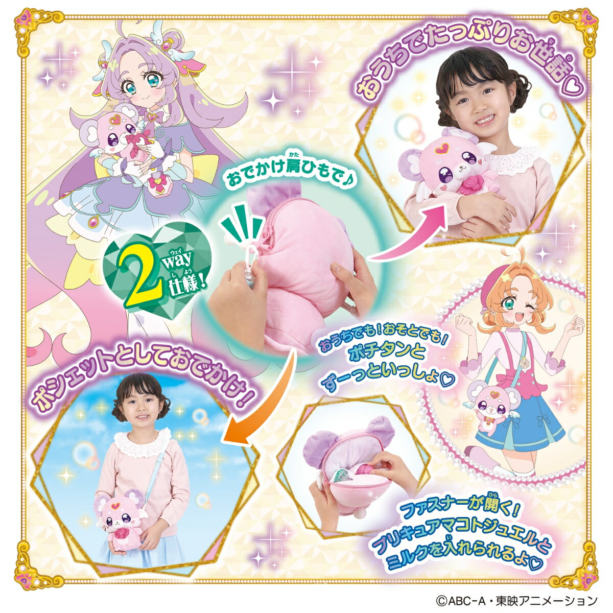 『名探偵プリキュア!』より、「おでかけしよ♪お世話して、かわいがって♥おしゃべりポチタン」が登場!お世話遊びがたっぷり♡おでかけ肩ひもを付け替えて、おうちでお世話とポシェットの2wayで遊べる、ポチタンのおしゃべりぬいぐるみです。プリキュアマコトジュエルをセットした回数に応じてポチタンのおしゃべり内容が3段階に成長!ポチタンの成長段階と、セットするプリキュアマコトジュエルによって、おしゃべり内容が変わります。なでなでお世話と、付属のミルクを用いたミルクお世話でも遊べます。[セット内容]・おしゃべりポチタン…1・カバーパーツ…1・プリキュアマコトジュエル(ポチタンver.)…1・ミルク…1・おでかけ肩ひも…1[使用電池]・単4乾電池×3本(別売り)(本商品のセット内容以外は付属しません。)【対象年齢】:3才〜