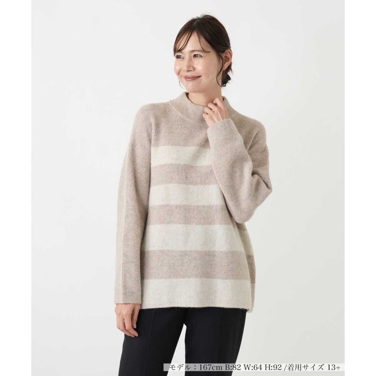 素材にこだわったニットコレクションから、ゆったりとしたシルエットと柔らかな風合いが魅力のハイネックセーター。毛をメインに、ナイロンとポリエステルをブレンドした暖かな素材は、これからの季節に快適な着心地をもたらします。ボーダー柄が、大人のリラックススタイルに上品なアクセントを添えます。ハイネックは首元を優しく包み込み、冷たい風から守ります。デイリー使いはもちろん、ちょっとしたお出かけにも活躍する汎用性の高いアイテムです。一枚で着ても様になり、長くご愛用いただけるタイムレスな一枚です。