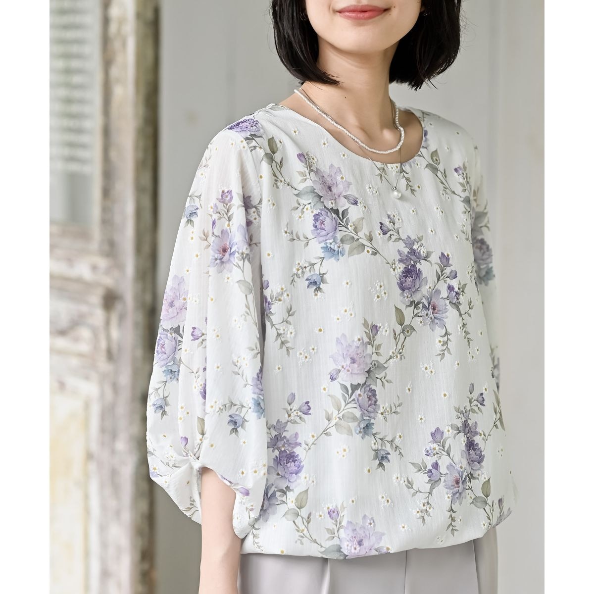 花柄スラブバンドカラー7分袖ブラウス